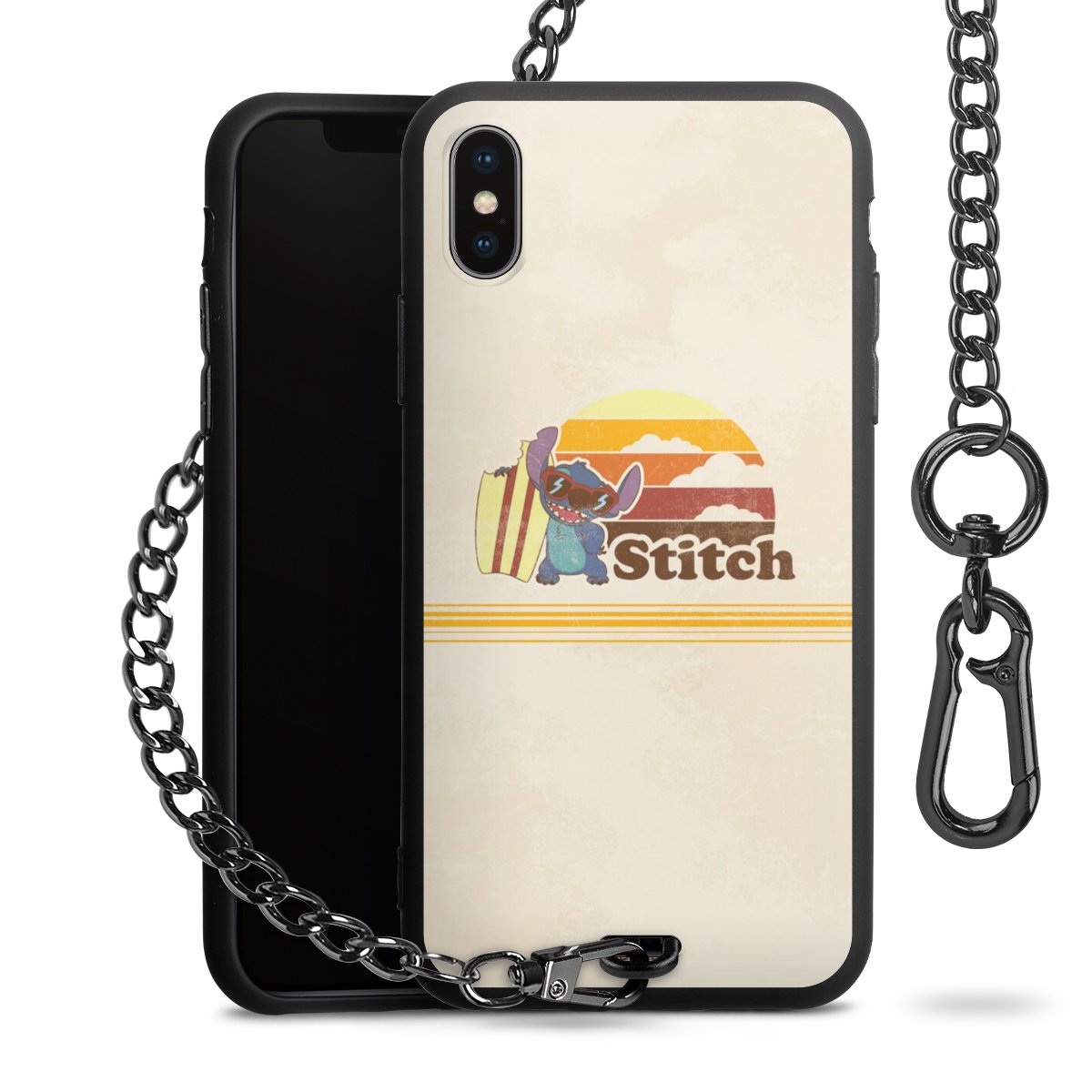 Die Handyhülle verfügt über eine mittig am unteren Rand platzierte Öse, an der die Metallkette stabil befestigt ist. Bestelle die Hülle einfach für Dein Smartphone-Modell, dann passt sie wie angegossen und Du brauchst sie bloß einmal anzudrücken. Handy in die Tasche, Karabiner an den Hosenbund – schon kann die Party starten.