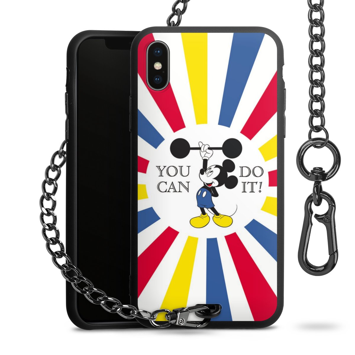 Die Handyhülle verfügt über eine mittig am unteren Rand platzierte Öse, an der die Metallkette stabil befestigt ist. Bestelle die Hülle einfach für Dein Smartphone-Modell, dann passt sie wie angegossen und Du brauchst sie bloß einmal anzudrücken. Handy in die Tasche, Karabiner an den Hosenbund – schon kann die Party starten.