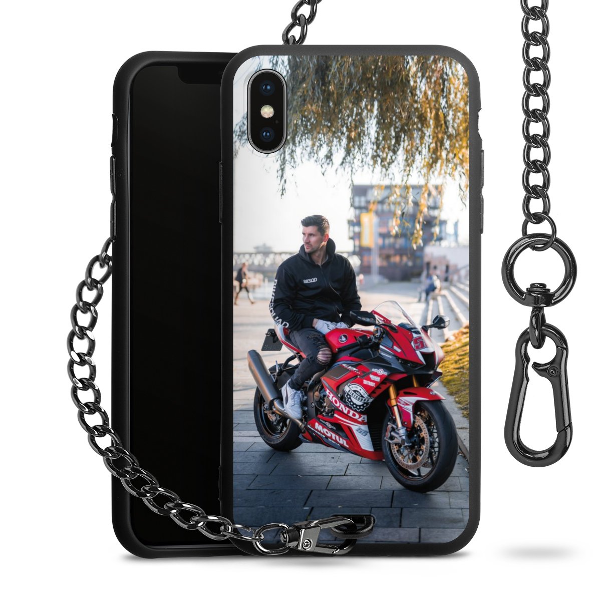 Die Handyhülle verfügt über eine mittig am unteren Rand platzierte Öse, an der die Metallkette stabil befestigt ist. Bestelle die Hülle einfach für Dein Smartphone-Modell, dann passt sie wie angegossen und Du brauchst sie bloß einmal anzudrücken. Handy in die Tasche, Karabiner an den Hosenbund – schon kann die Party starten.