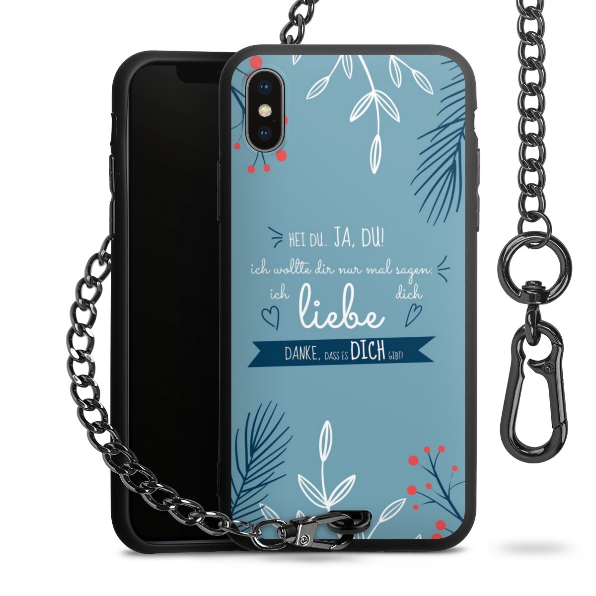 Die mattschwarze Silikon-Handyhülle besteht aus robustem TPU (thermoplastisches Polyurethan). Sie ist flexibel und schützt Dein Smartphone vor Stößen und Kratzern. Die Kette sowie der Karabinerhaken sind aus Metall in Gunmetal-Optik gefertigt. Für dieses Produkt kommen ausschließlich TÜV-geprüfte Materialien zum Einsatz.