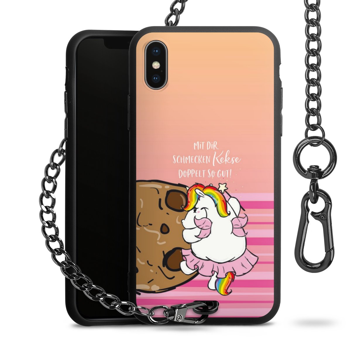 Die Handyhülle verfügt über eine mittig am unteren Rand platzierte Öse, an der die Metallkette stabil befestigt ist. Bestelle die Hülle einfach für Dein Smartphone-Modell, dann passt sie wie angegossen und Du brauchst sie bloß einmal anzudrücken. Handy in die Tasche, Karabiner an den Hosenbund – schon kann die Party starten.