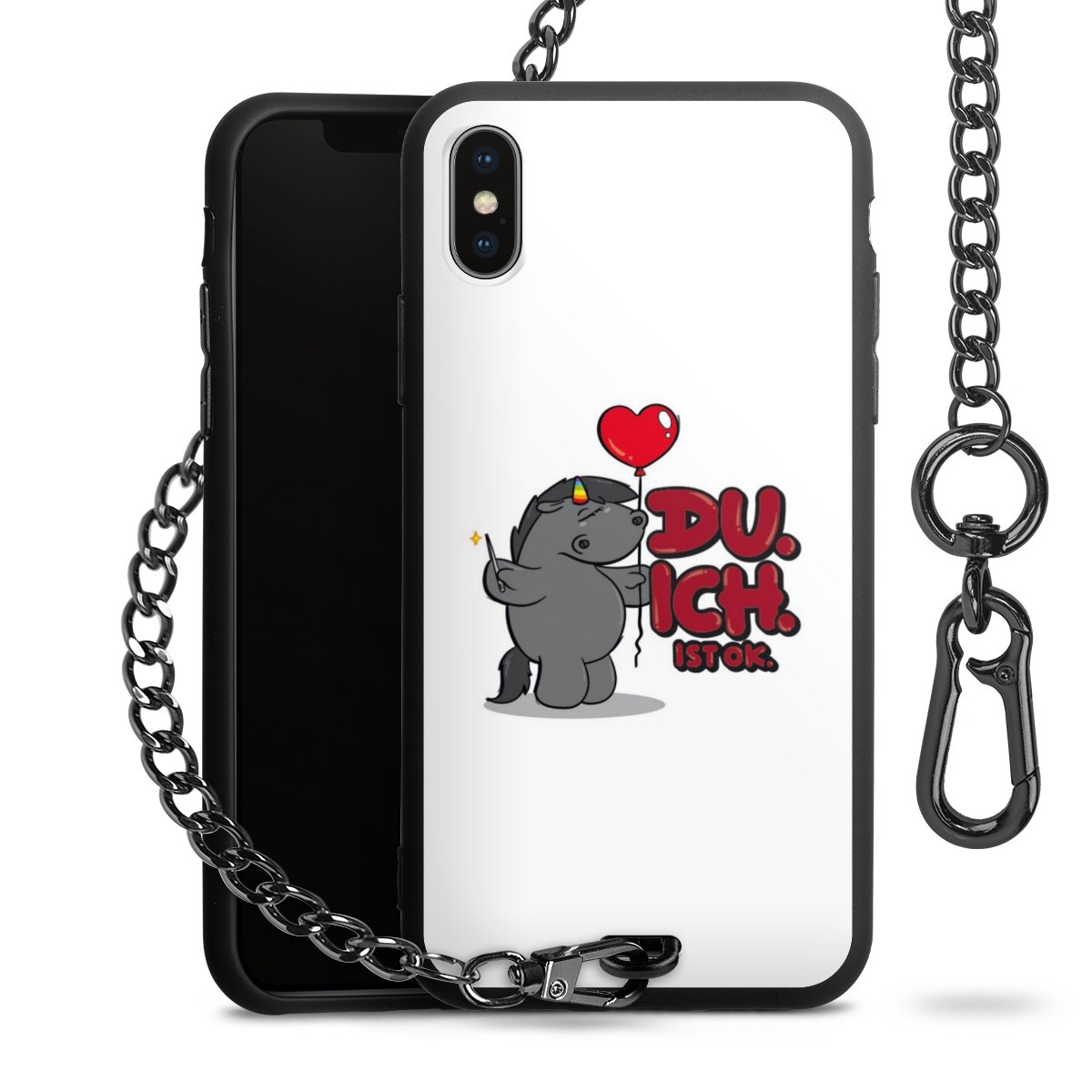 Die mattschwarze Silikon-Handyhülle besteht aus robustem TPU (thermoplastisches Polyurethan). Sie ist flexibel und schützt Dein Smartphone vor Stößen und Kratzern. Die Kette sowie der Karabinerhaken sind aus Metall in Gunmetal-Optik gefertigt. Für dieses Produkt kommen ausschließlich TÜV-geprüfte Materialien zum Einsatz.