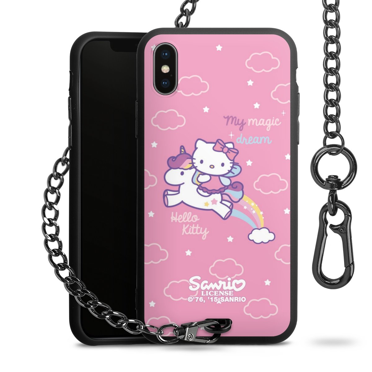 Die Handyhülle verfügt über eine mittig am unteren Rand platzierte Öse, an der die Metallkette stabil befestigt ist. Bestelle die Hülle einfach für Dein Smartphone-Modell, dann passt sie wie angegossen und Du brauchst sie bloß einmal anzudrücken. Handy in die Tasche, Karabiner an den Hosenbund – schon kann die Party starten.