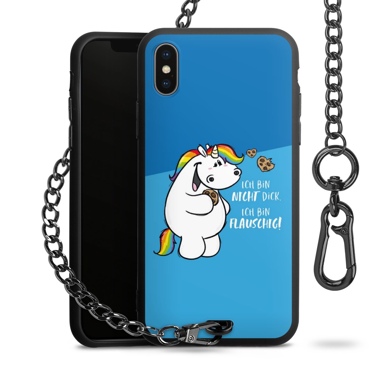 Die mattschwarze Silikon-Handyhülle besteht aus robustem TPU (thermoplastisches Polyurethan). Sie ist flexibel und schützt Dein Smartphone vor Stößen und Kratzern. Die Kette sowie der Karabinerhaken sind aus Metall in Gunmetal-Optik gefertigt. Für dieses Produkt kommen ausschließlich TÜV-geprüfte Materialien zum Einsatz.