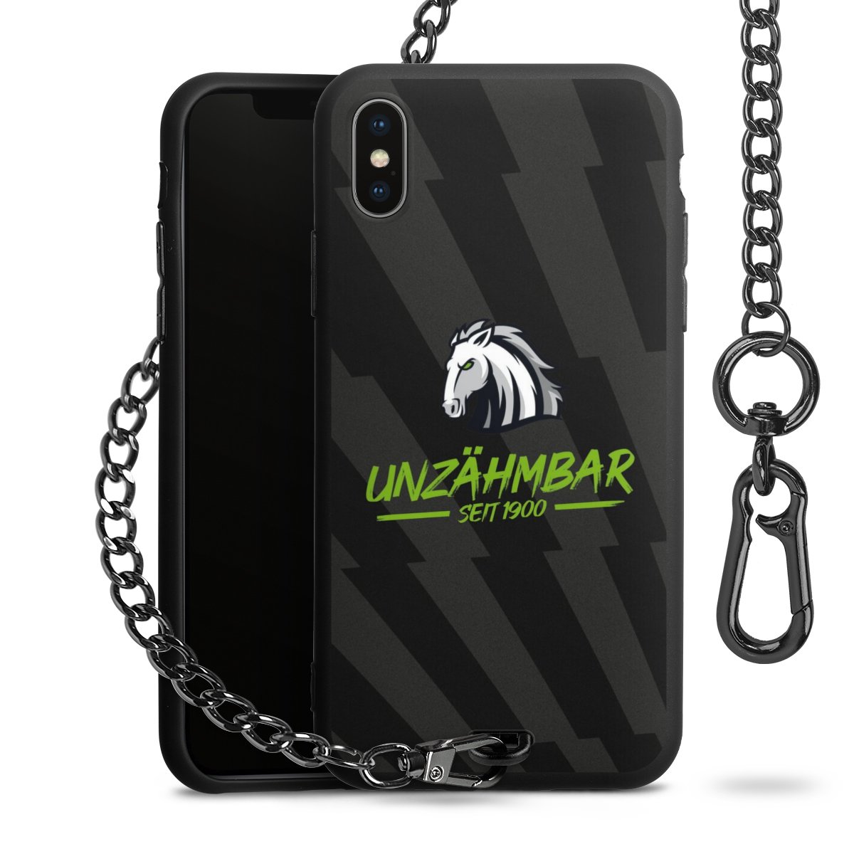 Die mattschwarze Silikon-Handyhülle besteht aus robustem TPU (thermoplastisches Polyurethan). Sie ist flexibel und schützt Dein Smartphone vor Stößen und Kratzern. Die Kette sowie der Karabinerhaken sind aus Metall in Gunmetal-Optik gefertigt. Für dieses Produkt kommen ausschließlich TÜV-geprüfte Materialien zum Einsatz.