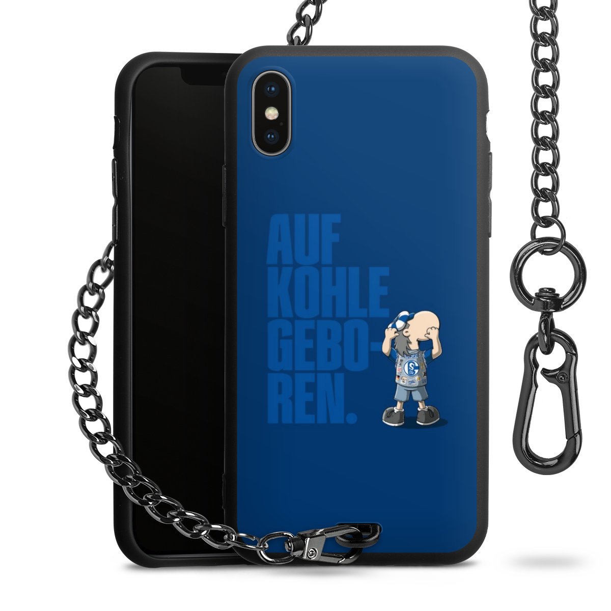 Die Handyhülle verfügt über eine mittig am unteren Rand platzierte Öse, an der die Metallkette stabil befestigt ist. Bestelle die Hülle einfach für Dein Smartphone-Modell, dann passt sie wie angegossen und Du brauchst sie bloß einmal anzudrücken. Handy in die Tasche, Karabiner an den Hosenbund – schon kann die Party starten.