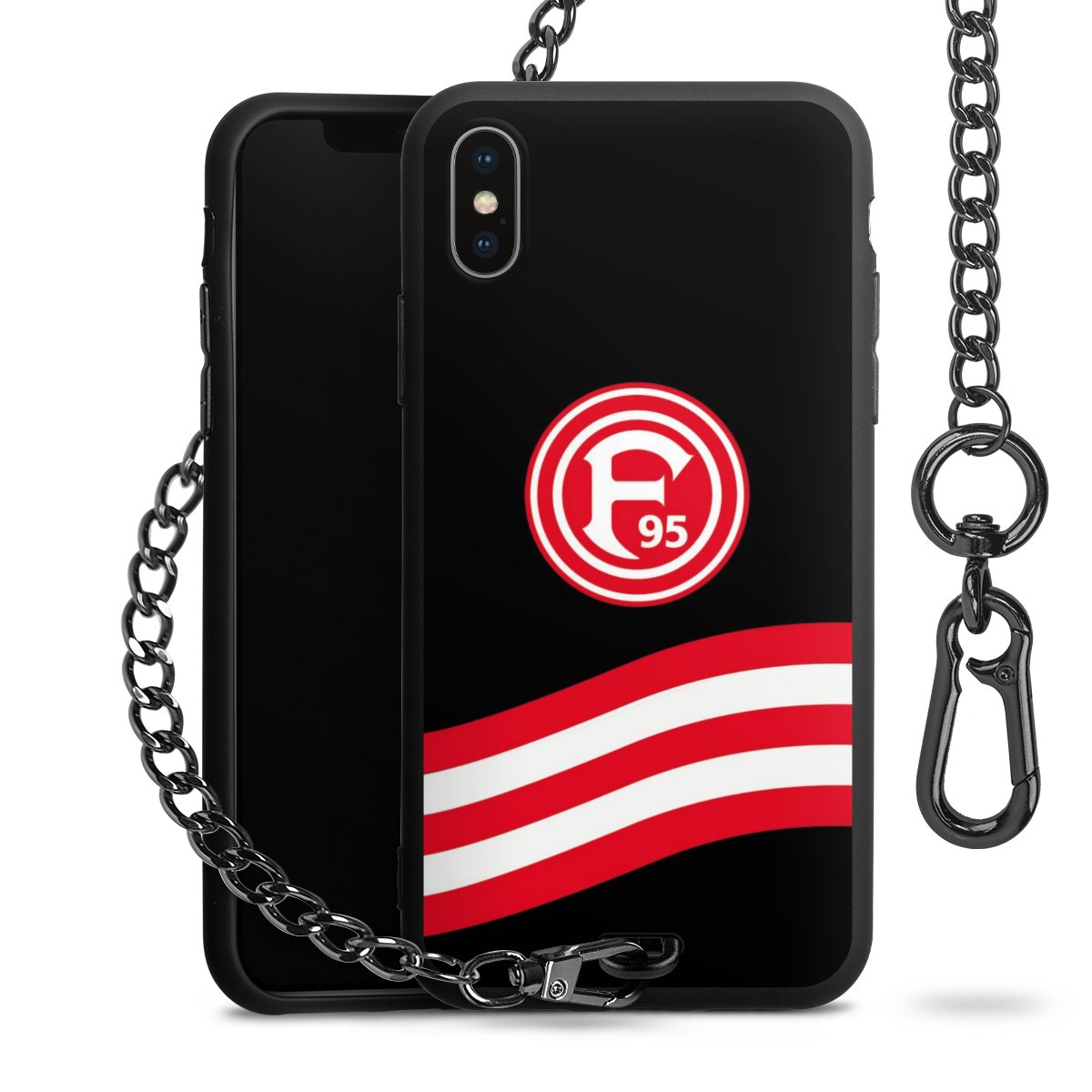 Die Handyhülle verfügt über eine mittig am unteren Rand platzierte Öse, an der die Metallkette stabil befestigt ist. Bestelle die Hülle einfach für Dein Smartphone-Modell, dann passt sie wie angegossen und Du brauchst sie bloß einmal anzudrücken. Handy in die Tasche, Karabiner an den Hosenbund – schon kann die Party starten.