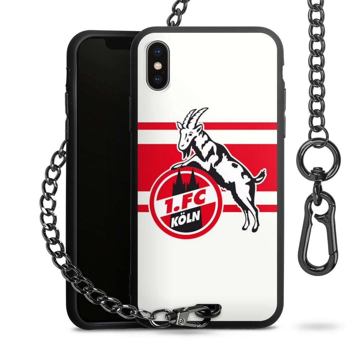 Die Handyhülle verfügt über eine mittig am unteren Rand platzierte Öse, an der die Metallkette stabil befestigt ist. Bestelle die Hülle einfach für Dein Smartphone-Modell, dann passt sie wie angegossen und Du brauchst sie bloß einmal anzudrücken. Handy in die Tasche, Karabiner an den Hosenbund – schon kann die Party starten.