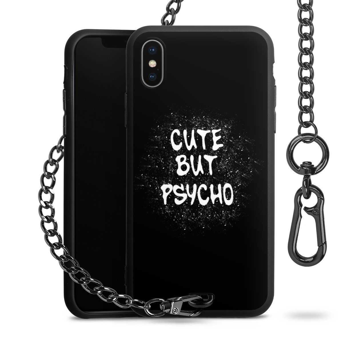 Die mattschwarze Silikon-Handyhülle besteht aus robustem TPU (thermoplastisches Polyurethan). Sie ist flexibel und schützt Dein Smartphone vor Stößen und Kratzern. Die Kette sowie der Karabinerhaken sind aus Metall in Gunmetal-Optik gefertigt. Für dieses Produkt kommen ausschließlich TÜV-geprüfte Materialien zum Einsatz.