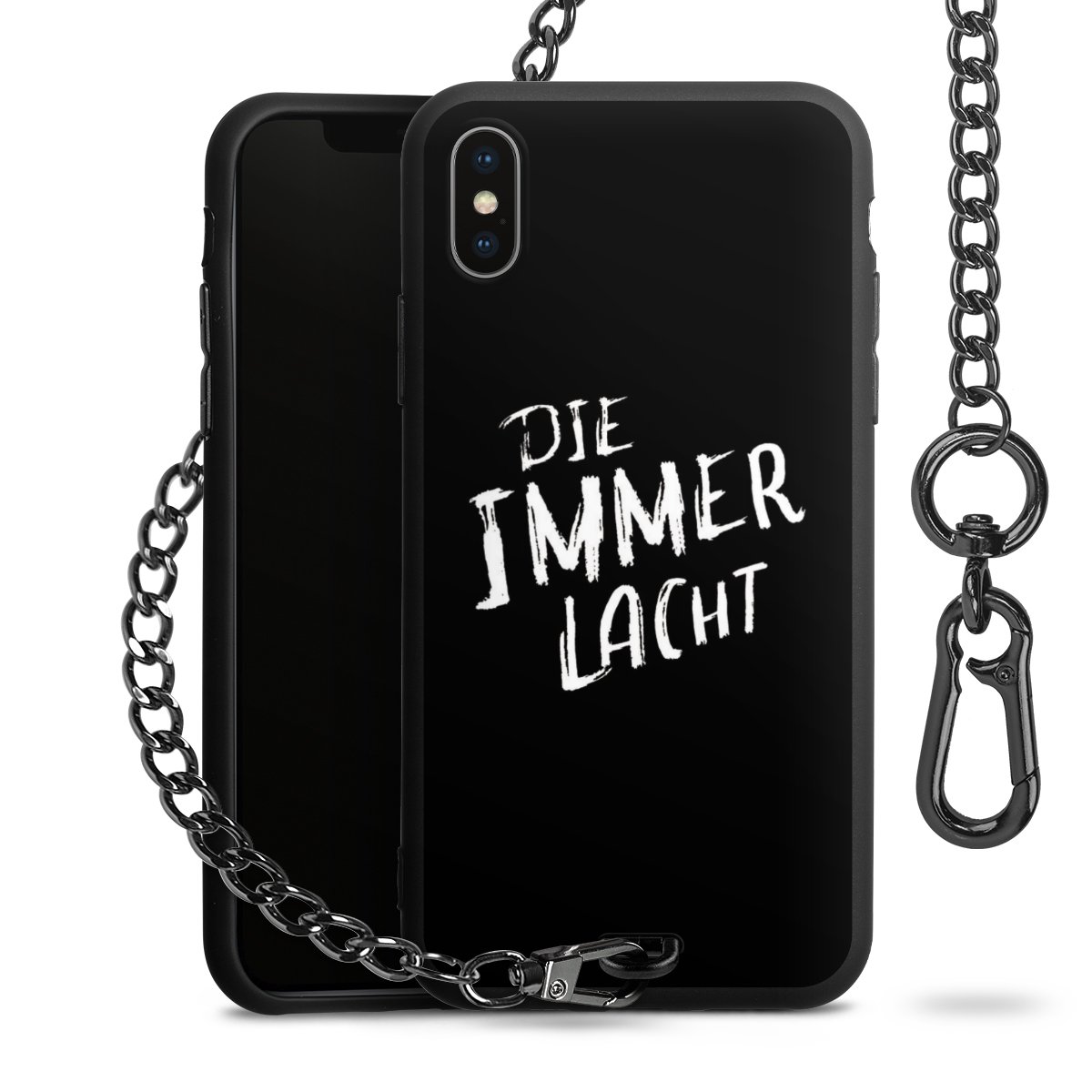 Die mattschwarze Silikon-Handyhülle besteht aus robustem TPU (thermoplastisches Polyurethan). Sie ist flexibel und schützt Dein Smartphone vor Stößen und Kratzern. Die Kette sowie der Karabinerhaken sind aus Metall in Gunmetal-Optik gefertigt. Für dieses Produkt kommen ausschließlich TÜV-geprüfte Materialien zum Einsatz.