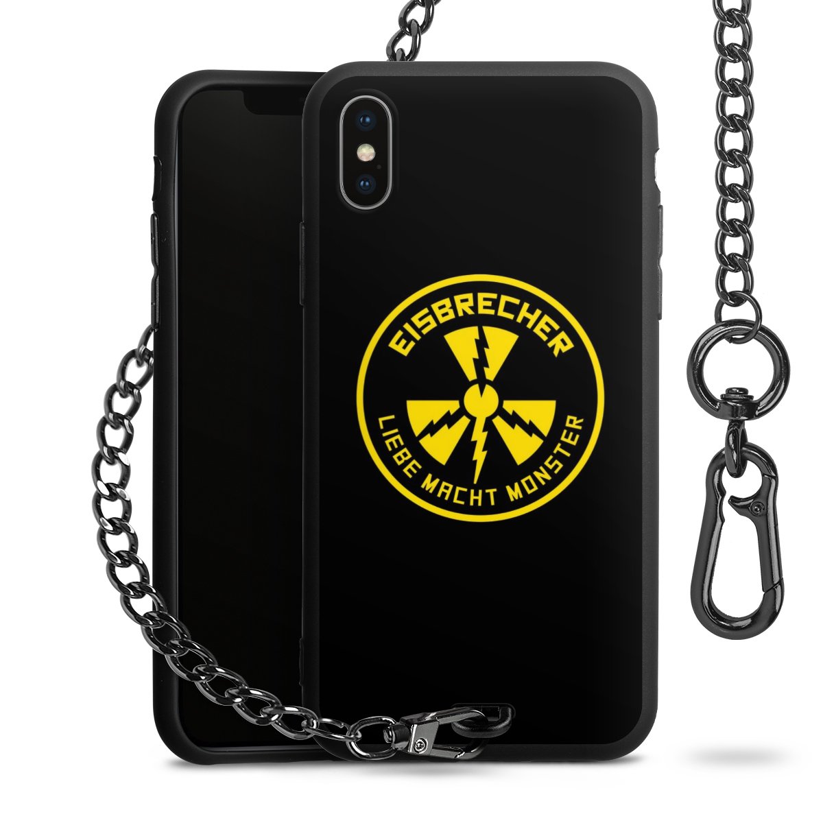Die mattschwarze Silikon-Handyhülle besteht aus robustem TPU (thermoplastisches Polyurethan). Sie ist flexibel und schützt Dein Smartphone vor Stößen und Kratzern. Die Kette sowie der Karabinerhaken sind aus Metall in Gunmetal-Optik gefertigt. Für dieses Produkt kommen ausschließlich TÜV-geprüfte Materialien zum Einsatz.