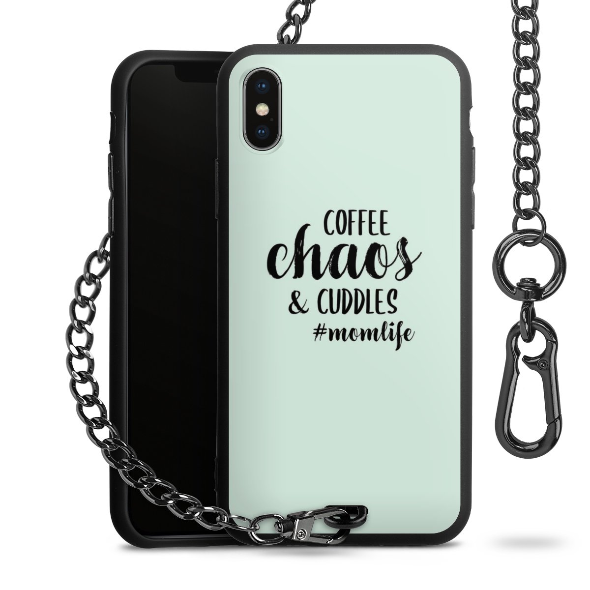 Die mattschwarze Silikon-Handyhülle besteht aus robustem TPU (thermoplastisches Polyurethan). Sie ist flexibel und schützt Dein Smartphone vor Stößen und Kratzern. Die Kette sowie der Karabinerhaken sind aus Metall in Gunmetal-Optik gefertigt. Für dieses Produkt kommen ausschließlich TÜV-geprüfte Materialien zum Einsatz.