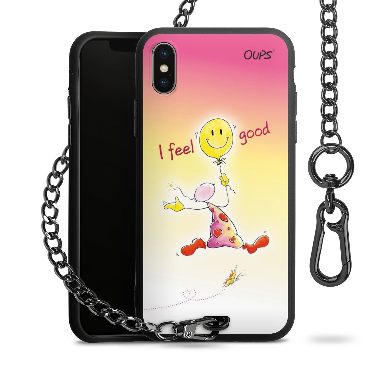 Die Handyhülle verfügt über eine mittig am unteren Rand platzierte Öse, an der die Metallkette stabil befestigt ist. Bestelle die Hülle einfach für Dein Smartphone-Modell, dann passt sie wie angegossen und Du brauchst sie bloß einmal anzudrücken. Handy in die Tasche, Karabiner an den Hosenbund – schon kann die Party starten.