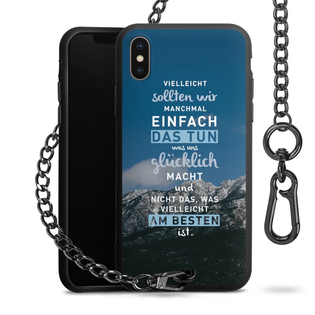 Die mattschwarze Silikon-Handyhülle besteht aus robustem TPU (thermoplastisches Polyurethan). Sie ist flexibel und schützt Dein Smartphone vor Stößen und Kratzern. Die Kette sowie der Karabinerhaken sind aus Metall in Gunmetal-Optik gefertigt. Für dieses Produkt kommen ausschließlich TÜV-geprüfte Materialien zum Einsatz.