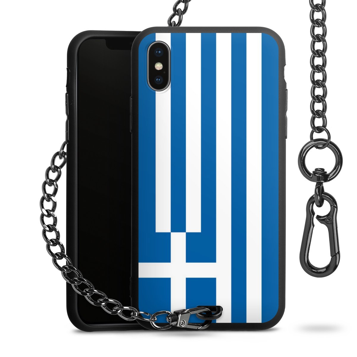 Die mattschwarze Silikon-Handyhülle besteht aus robustem TPU (thermoplastisches Polyurethan). Sie ist flexibel und schützt Dein Smartphone vor Stößen und Kratzern. Die Kette sowie der Karabinerhaken sind aus Metall in Gunmetal-Optik gefertigt. Für dieses Produkt kommen ausschließlich TÜV-geprüfte Materialien zum Einsatz.
