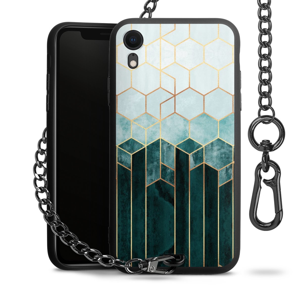 Die mattschwarze Silikon-Handyhülle besteht aus robustem TPU (thermoplastisches Polyurethan). Sie ist flexibel und schützt Dein Smartphone vor Stößen und Kratzern. Die Kette sowie der Karabinerhaken sind aus Metall in Gunmetal-Optik gefertigt. Für dieses Produkt kommen ausschließlich TÜV-geprüfte Materialien zum Einsatz.