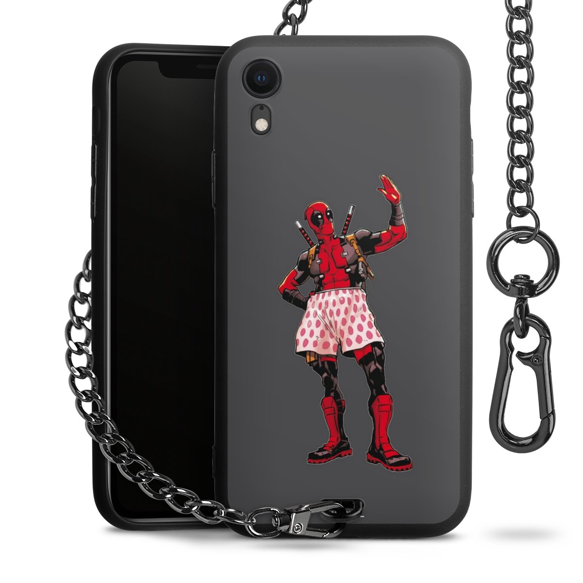 Die mattschwarze Silikon-Handyhülle besteht aus robustem TPU (thermoplastisches Polyurethan). Sie ist flexibel und schützt Dein Smartphone vor Stößen und Kratzern. Die Kette sowie der Karabinerhaken sind aus Metall in Gunmetal-Optik gefertigt. Für dieses Produkt kommen ausschließlich TÜV-geprüfte Materialien zum Einsatz.