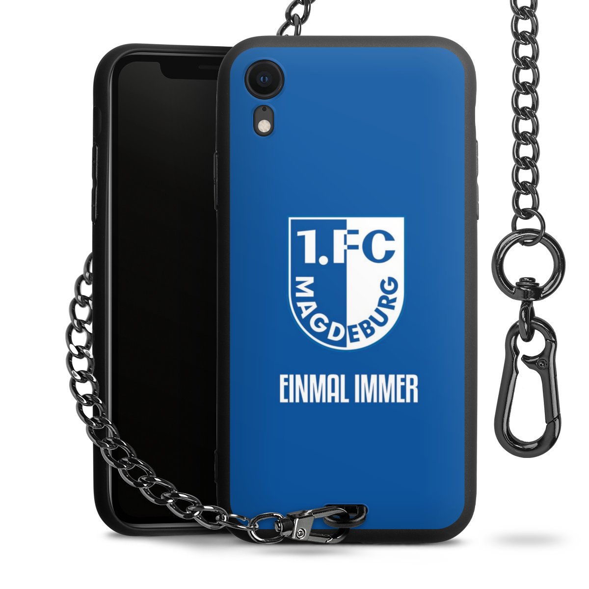 Die Handyhülle verfügt über eine mittig am unteren Rand platzierte Öse, an der die Metallkette stabil befestigt ist. Bestelle die Hülle einfach für Dein Smartphone-Modell, dann passt sie wie angegossen und Du brauchst sie bloß einmal anzudrücken. Handy in die Tasche, Karabiner an den Hosenbund – schon kann die Party starten.