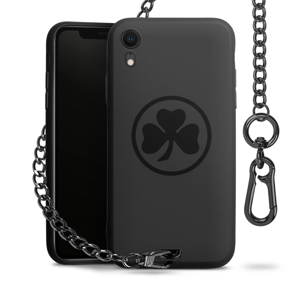 Die mattschwarze Silikon-Handyhülle besteht aus robustem TPU (thermoplastisches Polyurethan). Sie ist flexibel und schützt Dein Smartphone vor Stößen und Kratzern. Die Kette sowie der Karabinerhaken sind aus Metall in Gunmetal-Optik gefertigt. Für dieses Produkt kommen ausschließlich TÜV-geprüfte Materialien zum Einsatz.