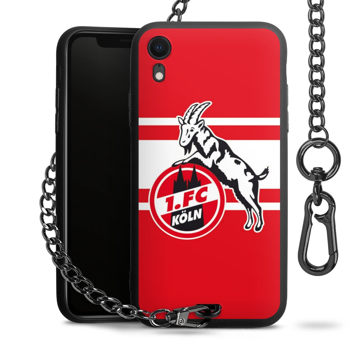 Die Handyhülle verfügt über eine mittig am unteren Rand platzierte Öse, an der die Metallkette stabil befestigt ist. Bestelle die Hülle einfach für Dein Smartphone-Modell, dann passt sie wie angegossen und Du brauchst sie bloß einmal anzudrücken. Handy in die Tasche, Karabiner an den Hosenbund – schon kann die Party starten.