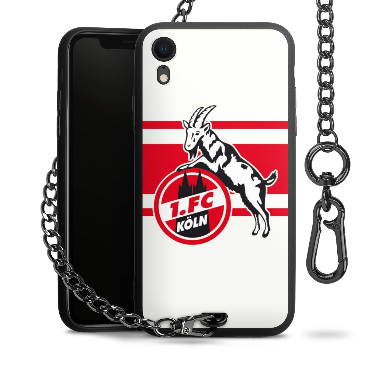 Die Handyhülle verfügt über eine mittig am unteren Rand platzierte Öse, an der die Metallkette stabil befestigt ist. Bestelle die Hülle einfach für Dein Smartphone-Modell, dann passt sie wie angegossen und Du brauchst sie bloß einmal anzudrücken. Handy in die Tasche, Karabiner an den Hosenbund – schon kann die Party starten.