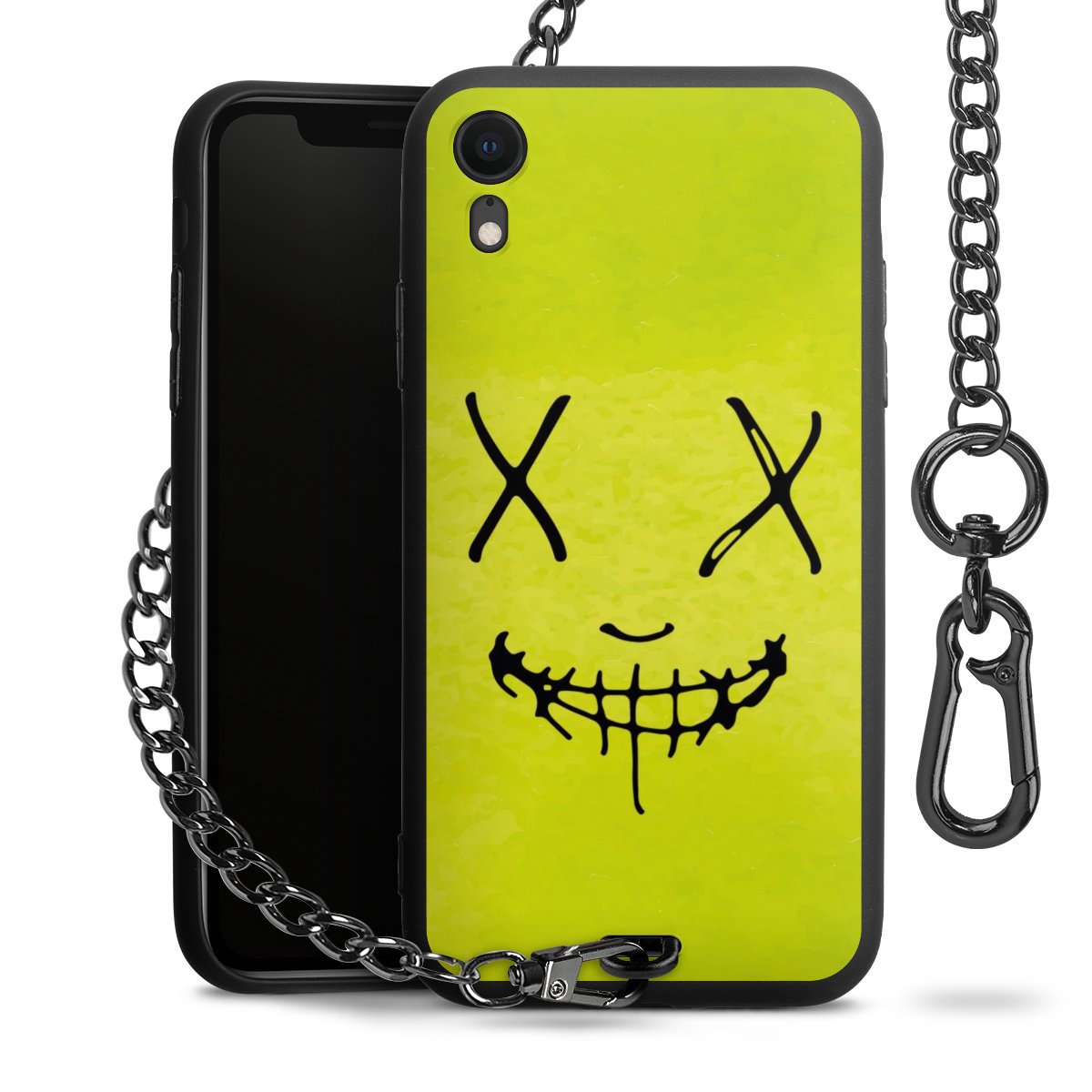 Die mattschwarze Silikon-Handyhülle besteht aus robustem TPU (thermoplastisches Polyurethan). Sie ist flexibel und schützt Dein Smartphone vor Stößen und Kratzern. Die Kette sowie der Karabinerhaken sind aus Metall in Gunmetal-Optik gefertigt. Für dieses Produkt kommen ausschließlich TÜV-geprüfte Materialien zum Einsatz.
