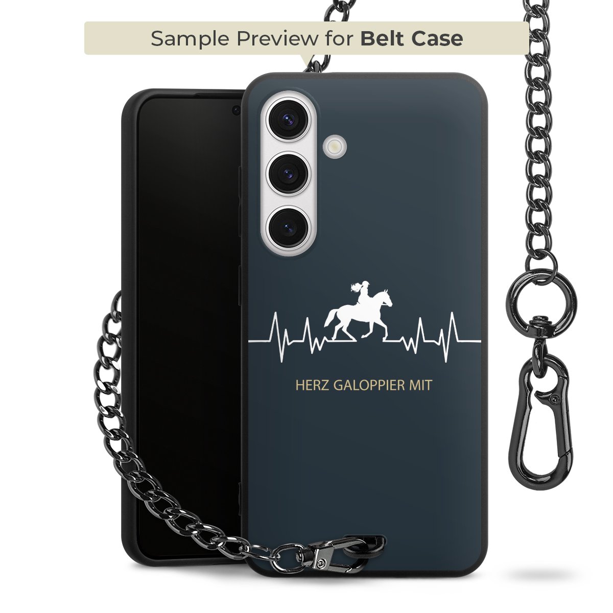 Ob im Alltag, beim Feiern mit Deinen Jungs oder auf Festivals – mit dem superpraktischen Belt Case steckst Du alle Sorgen um Diebstahl und Spider-App ganz entspannt in die Tasche. Es besteht aus einem coolen mattschwarzen Silikon Premium Case, dem Du ein individuelles Design verpassen kannst, und einer daran befestigten Kette in lässiger Gunmetal-Optik. Mit dem Karabiner auf der anderen Seite klickst Du die Kette mit einem Handgriff an Deine Gürtelschlaufe und schon ist Dein Smartphone sicher und stets griffbereit in der Hosentasche verstaut.