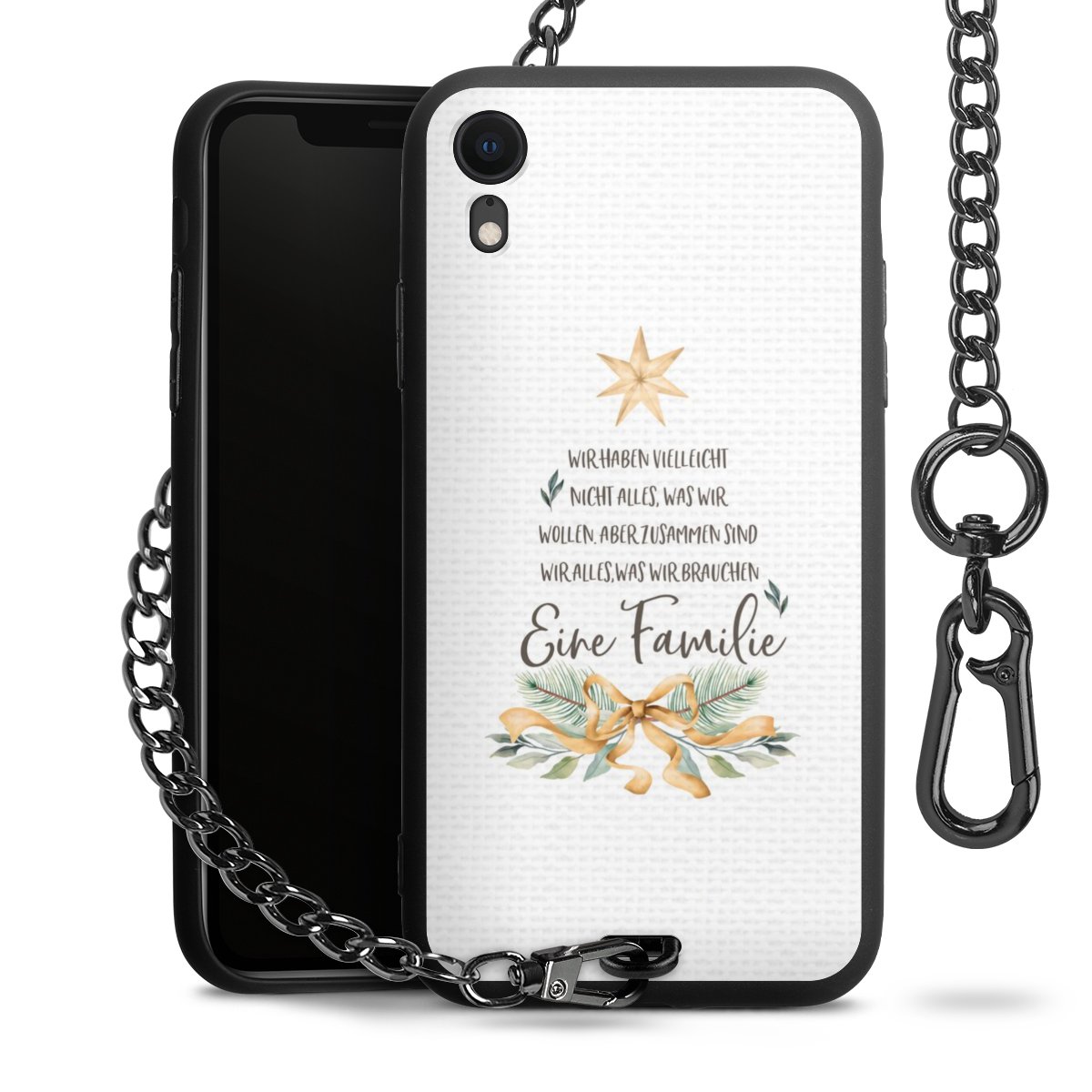 Die mattschwarze Silikon-Handyhülle besteht aus robustem TPU (thermoplastisches Polyurethan). Sie ist flexibel und schützt Dein Smartphone vor Stößen und Kratzern. Die Kette sowie der Karabinerhaken sind aus Metall in Gunmetal-Optik gefertigt. Für dieses Produkt kommen ausschließlich TÜV-geprüfte Materialien zum Einsatz.