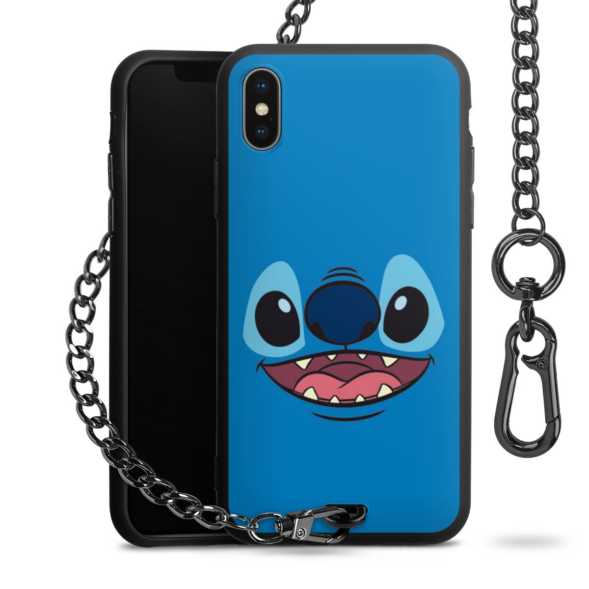Die Handyhülle verfügt über eine mittig am unteren Rand platzierte Öse, an der die Metallkette stabil befestigt ist. Bestelle die Hülle einfach für Dein Smartphone-Modell, dann passt sie wie angegossen und Du brauchst sie bloß einmal anzudrücken. Handy in die Tasche, Karabiner an den Hosenbund – schon kann die Party starten.
