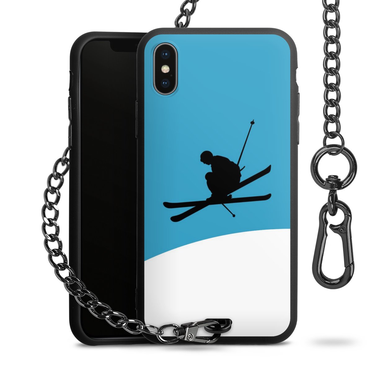 Die Handyhülle verfügt über eine mittig am unteren Rand platzierte Öse, an der die Metallkette stabil befestigt ist. Bestelle die Hülle einfach für Dein Smartphone-Modell, dann passt sie wie angegossen und Du brauchst sie bloß einmal anzudrücken. Handy in die Tasche, Karabiner an den Hosenbund – schon kann die Party starten.