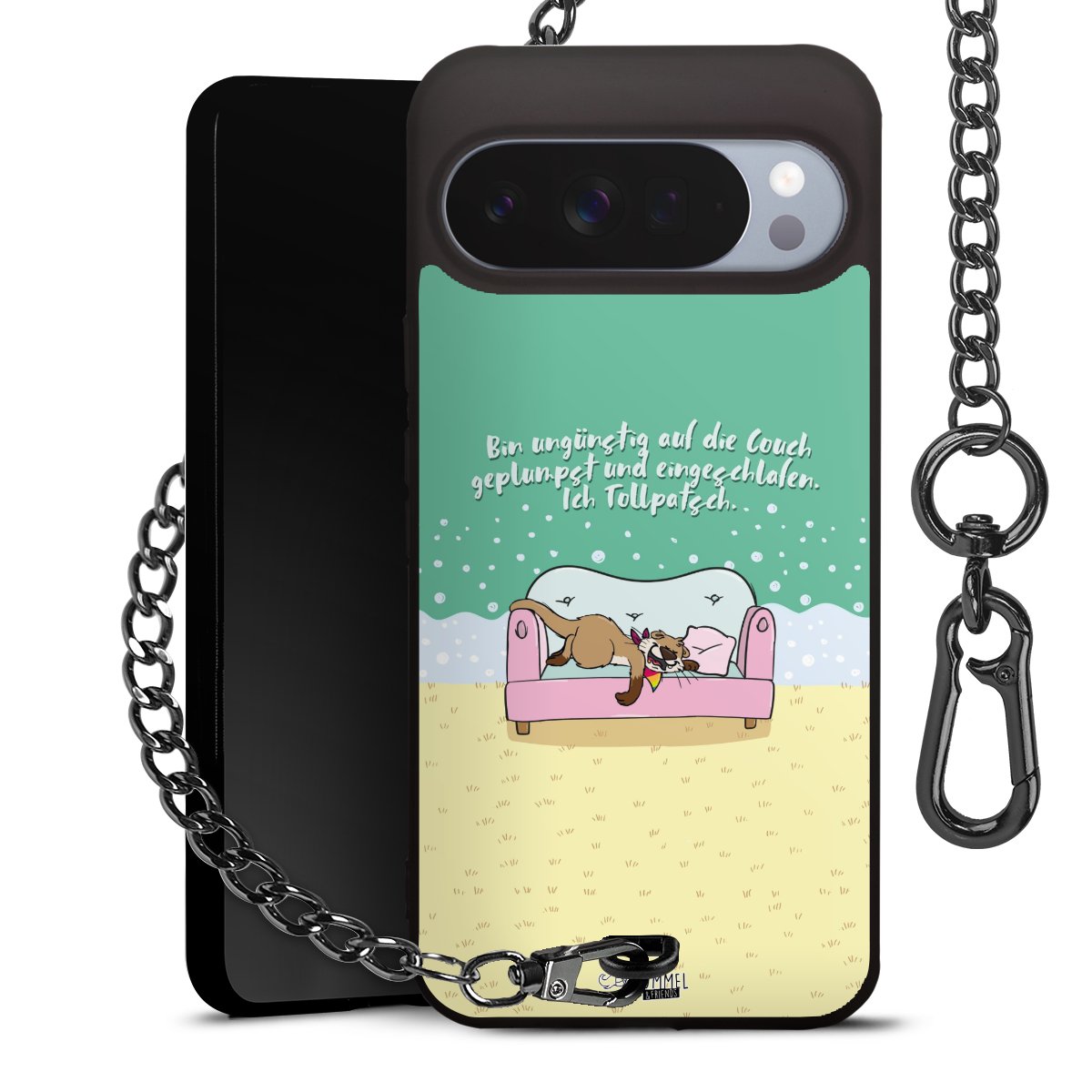 Die mattschwarze Silikon-Handyhülle besteht aus robustem TPU (thermoplastisches Polyurethan). Sie ist flexibel und schützt Dein Smartphone vor Stößen und Kratzern. Die Kette sowie der Karabinerhaken sind aus Metall in Gunmetal-Optik gefertigt. Für dieses Produkt kommen ausschließlich TÜV-geprüfte Materialien zum Einsatz.