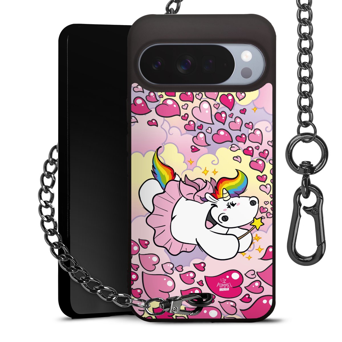 Die mattschwarze Silikon-Handyhülle besteht aus robustem TPU (thermoplastisches Polyurethan). Sie ist flexibel und schützt Dein Smartphone vor Stößen und Kratzern. Die Kette sowie der Karabinerhaken sind aus Metall in Gunmetal-Optik gefertigt. Für dieses Produkt kommen ausschließlich TÜV-geprüfte Materialien zum Einsatz.