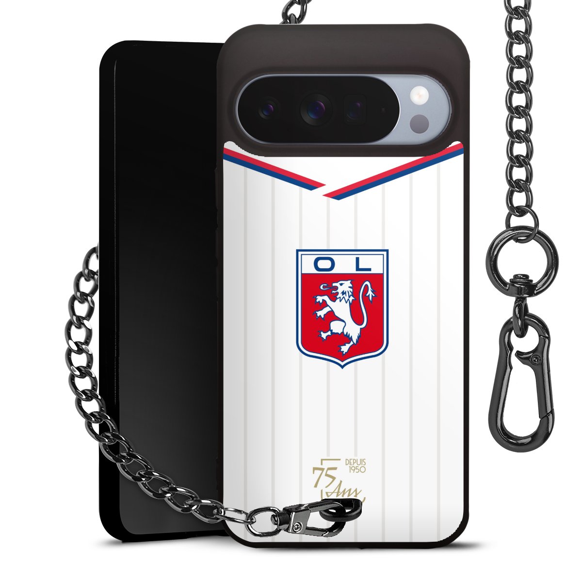 Die Handyhülle verfügt über eine mittig am unteren Rand platzierte Öse, an der die Metallkette stabil befestigt ist. Bestelle die Hülle einfach für Dein Smartphone-Modell, dann passt sie wie angegossen und Du brauchst sie bloß einmal anzudrücken. Handy in die Tasche, Karabiner an den Hosenbund – schon kann die Party starten.