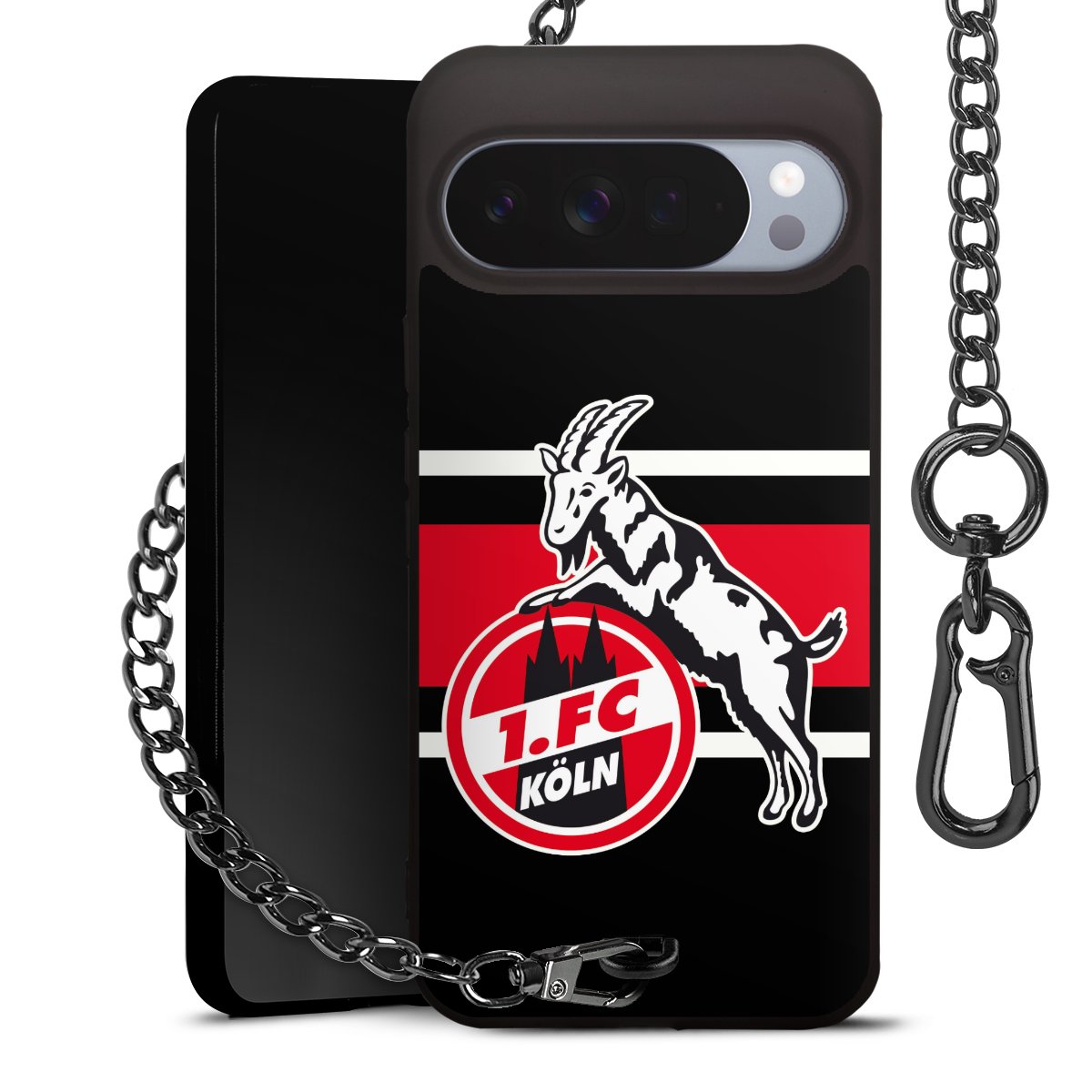 Die Handyhülle verfügt über eine mittig am unteren Rand platzierte Öse, an der die Metallkette stabil befestigt ist. Bestelle die Hülle einfach für Dein Smartphone-Modell, dann passt sie wie angegossen und Du brauchst sie bloß einmal anzudrücken. Handy in die Tasche, Karabiner an den Hosenbund – schon kann die Party starten.