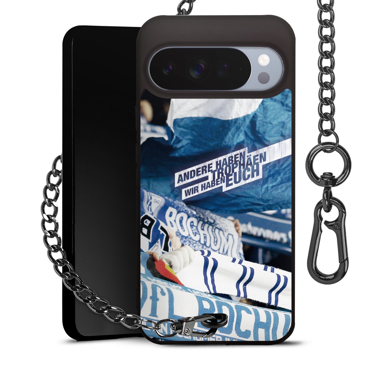 Die mattschwarze Silikon-Handyhülle besteht aus robustem TPU (thermoplastisches Polyurethan). Sie ist flexibel und schützt Dein Smartphone vor Stößen und Kratzern. Die Kette sowie der Karabinerhaken sind aus Metall in Gunmetal-Optik gefertigt. Für dieses Produkt kommen ausschließlich TÜV-geprüfte Materialien zum Einsatz.