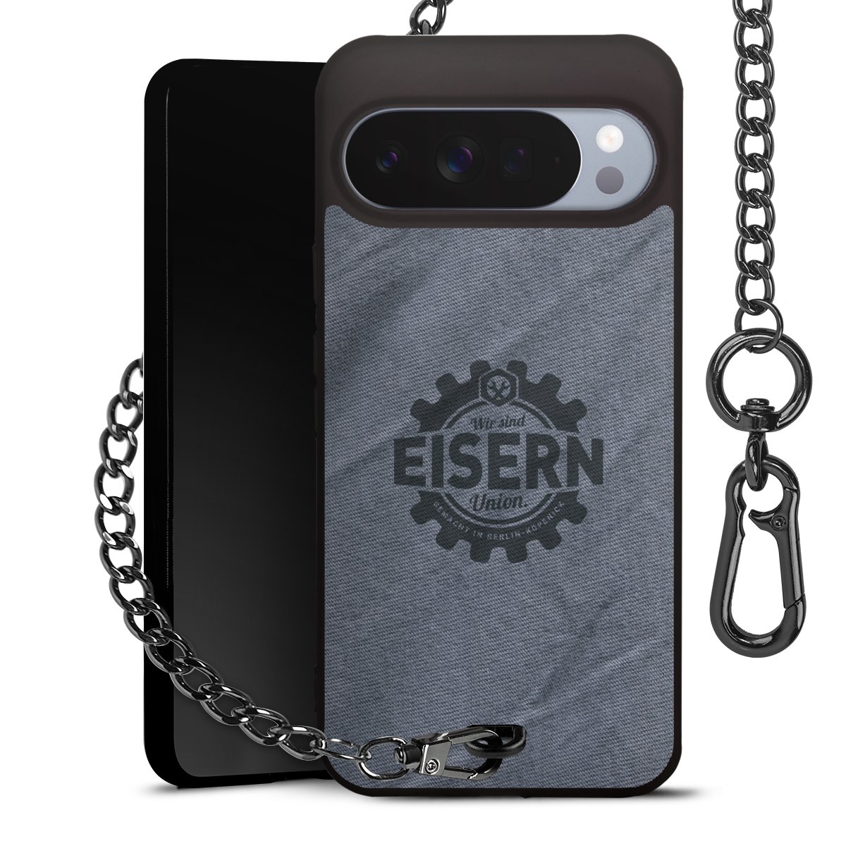Die mattschwarze Silikon-Handyhülle besteht aus robustem TPU (thermoplastisches Polyurethan). Sie ist flexibel und schützt Dein Smartphone vor Stößen und Kratzern. Die Kette sowie der Karabinerhaken sind aus Metall in Gunmetal-Optik gefertigt. Für dieses Produkt kommen ausschließlich TÜV-geprüfte Materialien zum Einsatz.