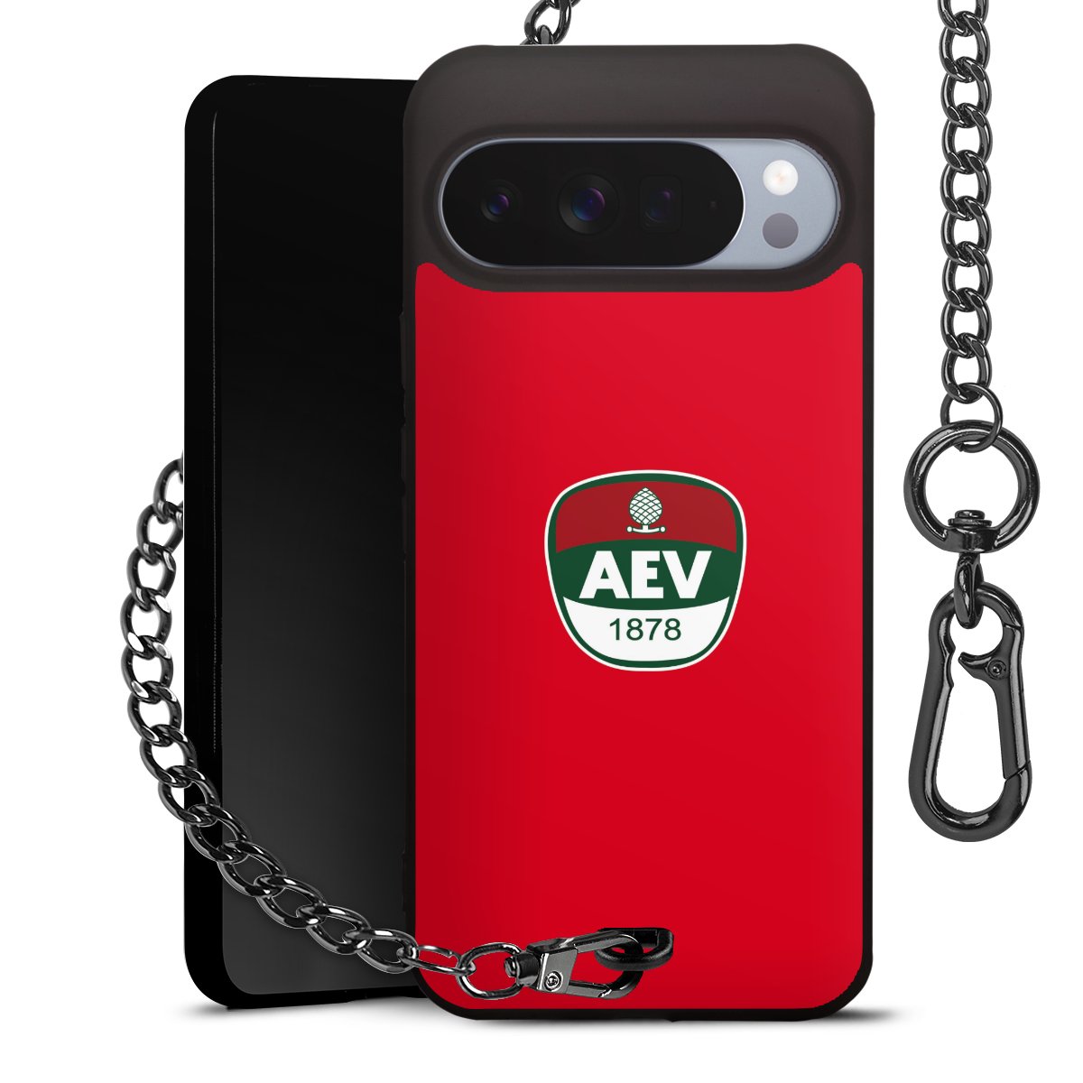 Die mattschwarze Silikon-Handyhülle besteht aus robustem TPU (thermoplastisches Polyurethan). Sie ist flexibel und schützt Dein Smartphone vor Stößen und Kratzern. Die Kette sowie der Karabinerhaken sind aus Metall in Gunmetal-Optik gefertigt. Für dieses Produkt kommen ausschließlich TÜV-geprüfte Materialien zum Einsatz.