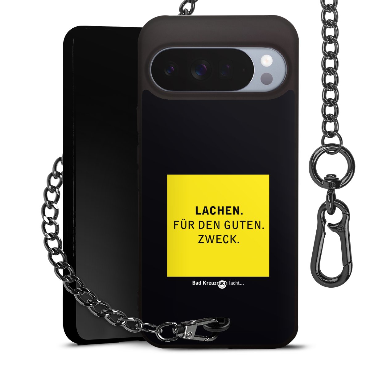 Die mattschwarze Silikon-Handyhülle besteht aus robustem TPU (thermoplastisches Polyurethan). Sie ist flexibel und schützt Dein Smartphone vor Stößen und Kratzern. Die Kette sowie der Karabinerhaken sind aus Metall in Gunmetal-Optik gefertigt. Für dieses Produkt kommen ausschließlich TÜV-geprüfte Materialien zum Einsatz.