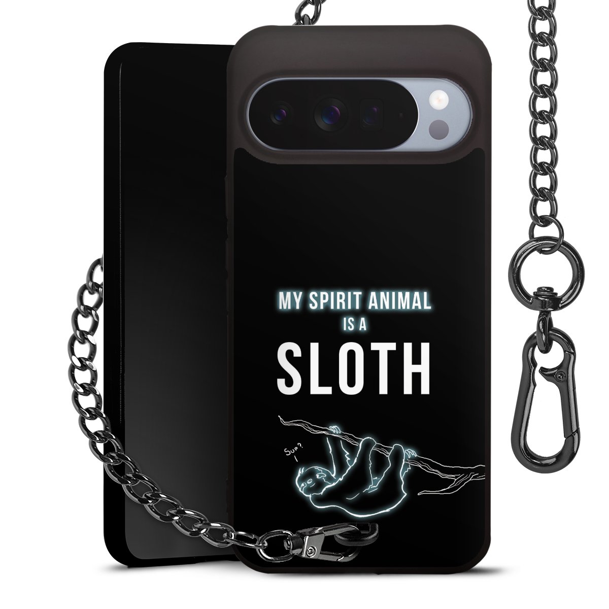 Die mattschwarze Silikon-Handyhülle besteht aus robustem TPU (thermoplastisches Polyurethan). Sie ist flexibel und schützt Dein Smartphone vor Stößen und Kratzern. Die Kette sowie der Karabinerhaken sind aus Metall in Gunmetal-Optik gefertigt. Für dieses Produkt kommen ausschließlich TÜV-geprüfte Materialien zum Einsatz.
