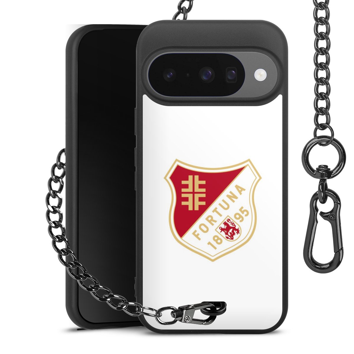 Die mattschwarze Silikon-Handyhülle besteht aus robustem TPU (thermoplastisches Polyurethan). Sie ist flexibel und schützt Dein Smartphone vor Stößen und Kratzern. Die Kette sowie der Karabinerhaken sind aus Metall in Gunmetal-Optik gefertigt. Für dieses Produkt kommen ausschließlich TÜV-geprüfte Materialien zum Einsatz.