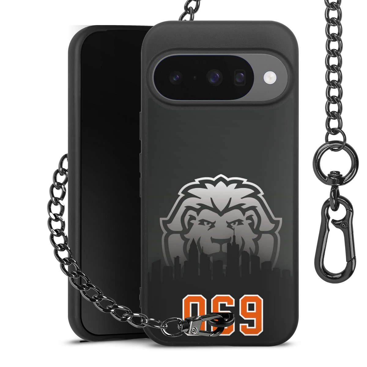 - Mattschwarze Handyhülle mit Metallkette