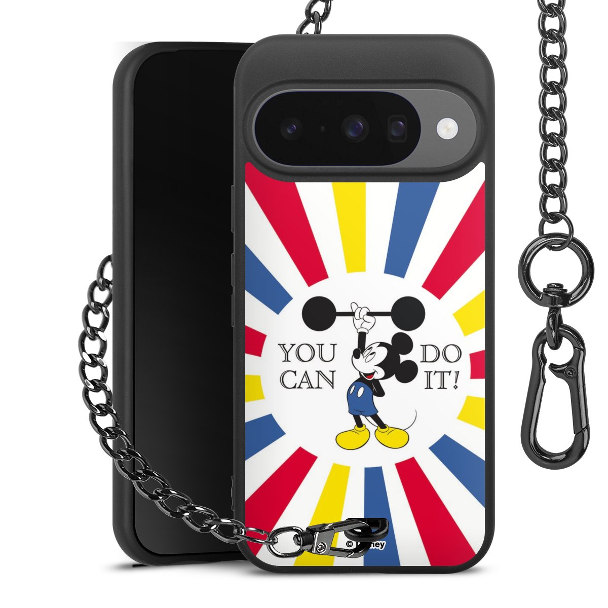 Die Handyhülle verfügt über eine mittig am unteren Rand platzierte Öse, an der die Metallkette stabil befestigt ist. Bestelle die Hülle einfach für Dein Smartphone-Modell, dann passt sie wie angegossen und Du brauchst sie bloß einmal anzudrücken. Handy in die Tasche, Karabiner an den Hosenbund – schon kann die Party starten.