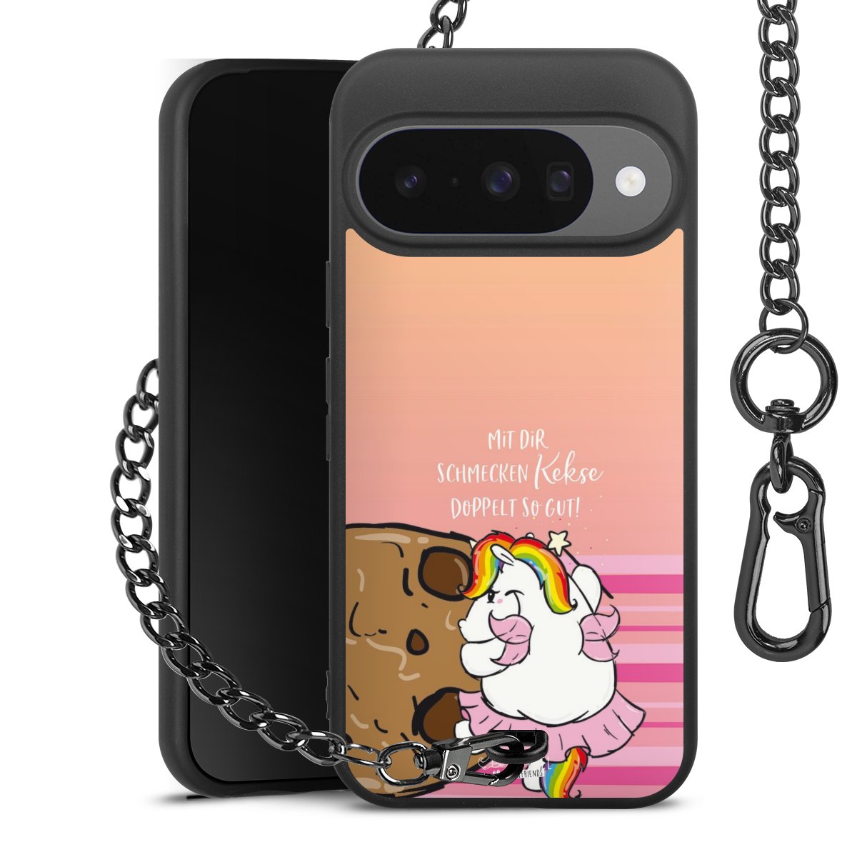 Die mattschwarze Silikon-Handyhülle besteht aus robustem TPU (thermoplastisches Polyurethan). Sie ist flexibel und schützt Dein Smartphone vor Stößen und Kratzern. Die Kette sowie der Karabinerhaken sind aus Metall in Gunmetal-Optik gefertigt. Für dieses Produkt kommen ausschließlich TÜV-geprüfte Materialien zum Einsatz.