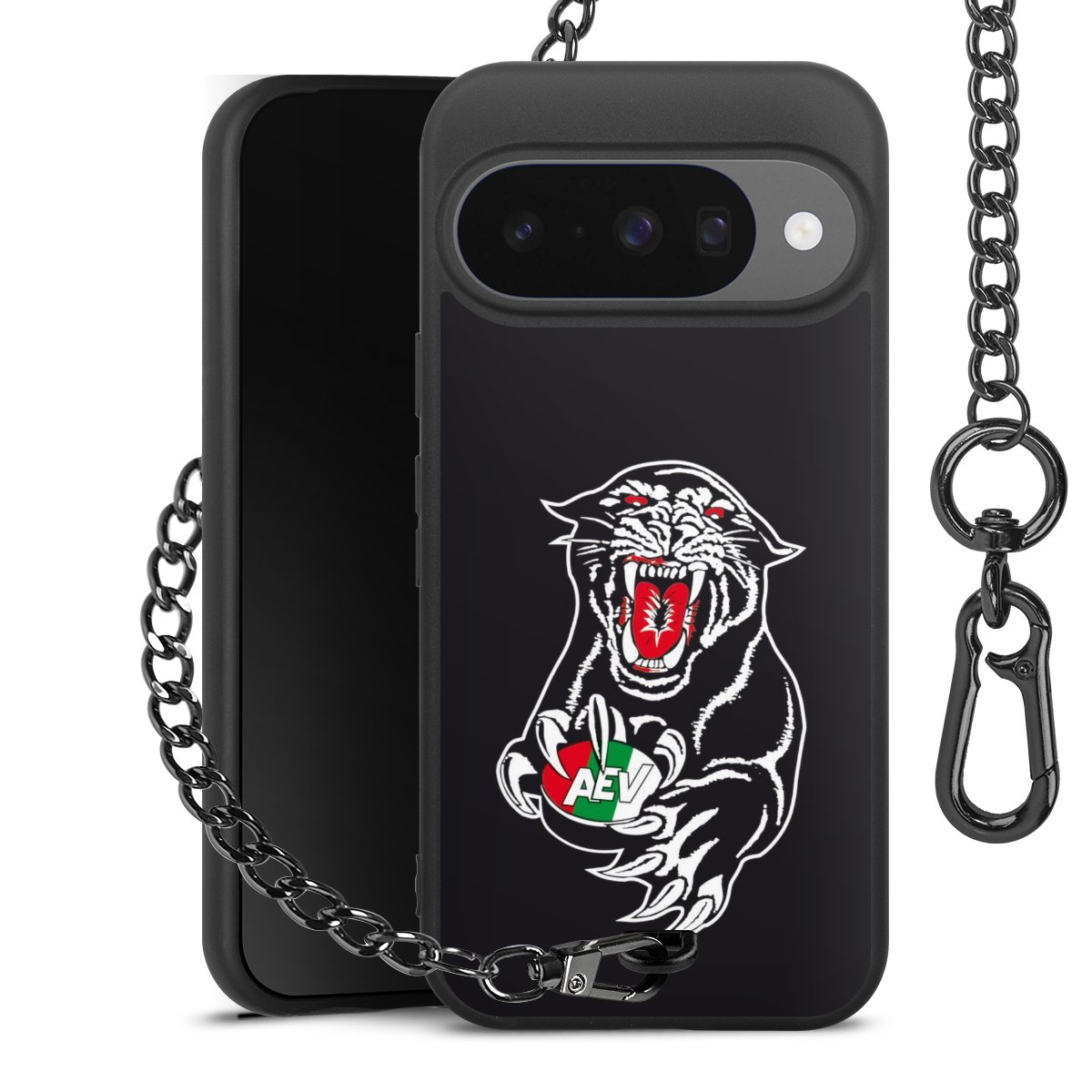 Die mattschwarze Silikon-Handyhülle besteht aus robustem TPU (thermoplastisches Polyurethan). Sie ist flexibel und schützt Dein Smartphone vor Stößen und Kratzern. Die Kette sowie der Karabinerhaken sind aus Metall in Gunmetal-Optik gefertigt. Für dieses Produkt kommen ausschließlich TÜV-geprüfte Materialien zum Einsatz.