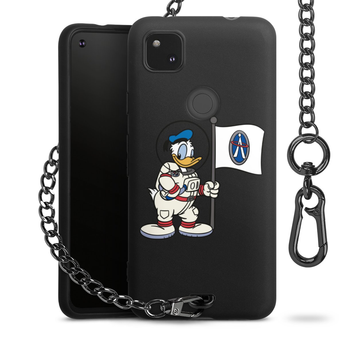 Die Handyhülle verfügt über eine mittig am unteren Rand platzierte Öse, an der die Metallkette stabil befestigt ist. Bestelle die Hülle einfach für Dein Smartphone-Modell, dann passt sie wie angegossen und Du brauchst sie bloß einmal anzudrücken. Handy in die Tasche, Karabiner an den Hosenbund – schon kann die Party starten.