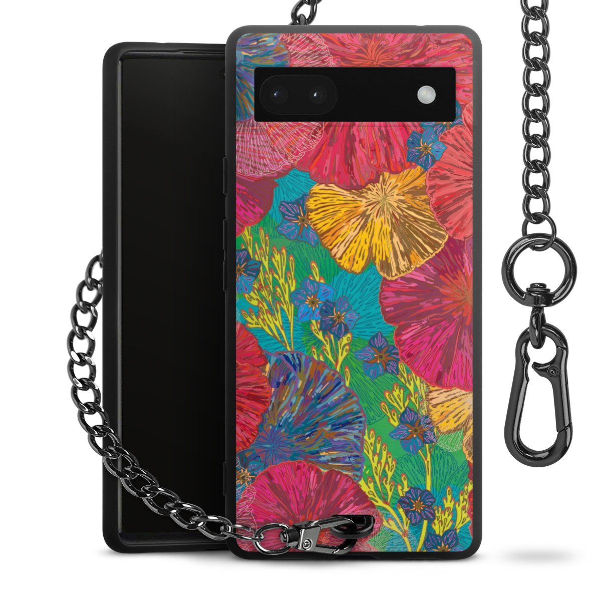 Die mattschwarze Silikon-Handyhülle besteht aus robustem TPU (thermoplastisches Polyurethan). Sie ist flexibel und schützt Dein Smartphone vor Stößen und Kratzern. Die Kette sowie der Karabinerhaken sind aus Metall in Gunmetal-Optik gefertigt. Für dieses Produkt kommen ausschließlich TÜV-geprüfte Materialien zum Einsatz.