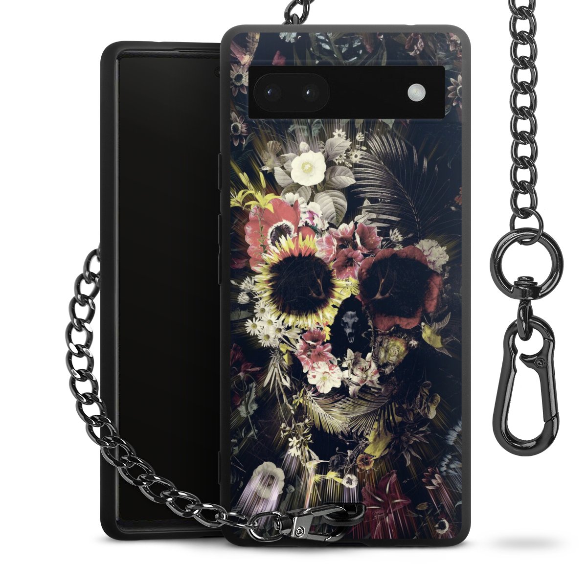Die mattschwarze Silikon-Handyhülle besteht aus robustem TPU (thermoplastisches Polyurethan). Sie ist flexibel und schützt Dein Smartphone vor Stößen und Kratzern. Die Kette sowie der Karabinerhaken sind aus Metall in Gunmetal-Optik gefertigt. Für dieses Produkt kommen ausschließlich TÜV-geprüfte Materialien zum Einsatz.