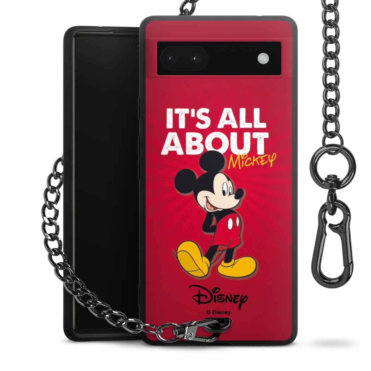 Die Handyhülle verfügt über eine mittig am unteren Rand platzierte Öse, an der die Metallkette stabil befestigt ist. Bestelle die Hülle einfach für Dein Smartphone-Modell, dann passt sie wie angegossen und Du brauchst sie bloß einmal anzudrücken. Handy in die Tasche, Karabiner an den Hosenbund – schon kann die Party starten.