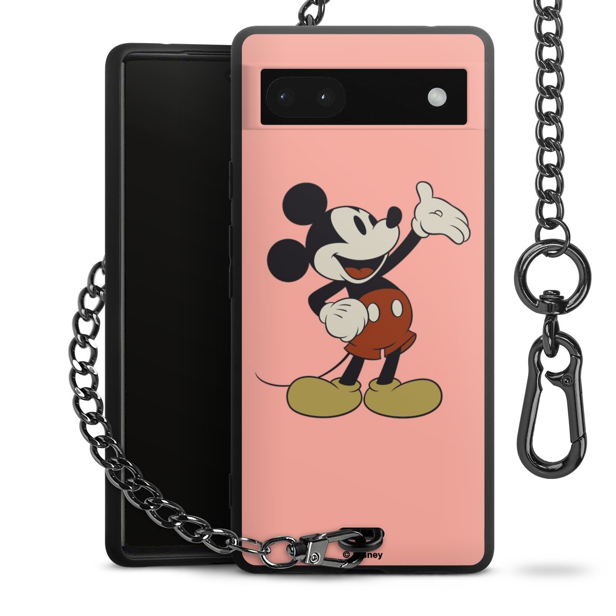 Die Handyhülle verfügt über eine mittig am unteren Rand platzierte Öse, an der die Metallkette stabil befestigt ist. Bestelle die Hülle einfach für Dein Smartphone-Modell, dann passt sie wie angegossen und Du brauchst sie bloß einmal anzudrücken. Handy in die Tasche, Karabiner an den Hosenbund – schon kann die Party starten.
