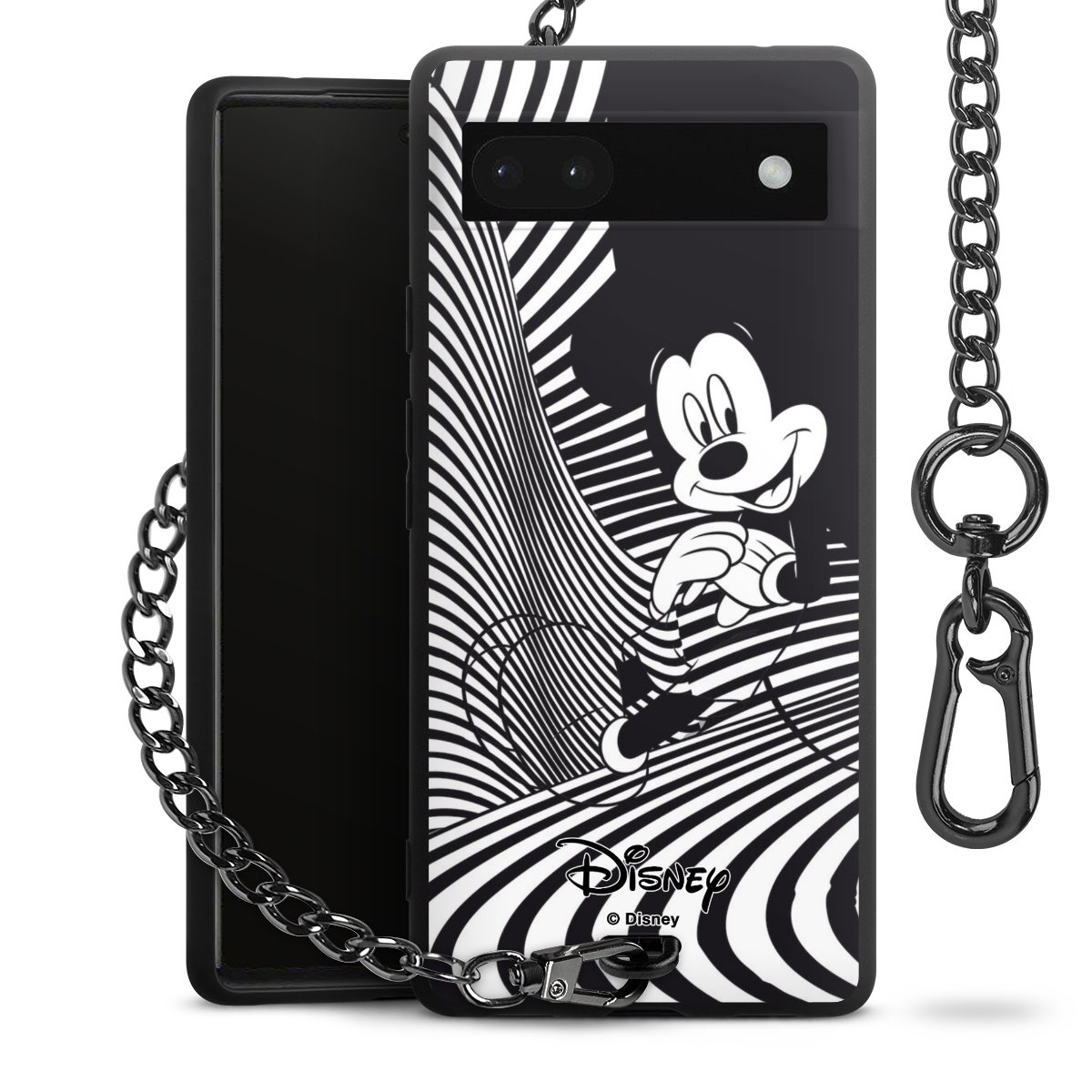 Die Handyhülle verfügt über eine mittig am unteren Rand platzierte Öse, an der die Metallkette stabil befestigt ist. Bestelle die Hülle einfach für Dein Smartphone-Modell, dann passt sie wie angegossen und Du brauchst sie bloß einmal anzudrücken. Handy in die Tasche, Karabiner an den Hosenbund – schon kann die Party starten.